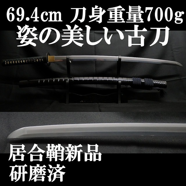 【古刀】69.4cm 刀身重量700g 元幅約3.1cm 元重 約7mm 研磨済み。居合鞘新品!!