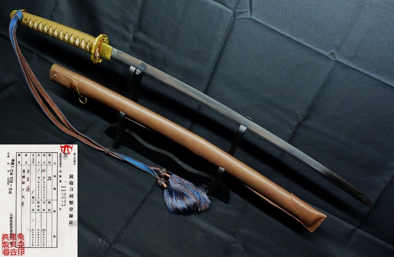 【現代刀】陸軍受命刀工 小島吉道 軍刀革カバー新品、柄糸巻直、研磨済 66.7cm 元幅3.4cm 元重約8mm 刀身重量 732g