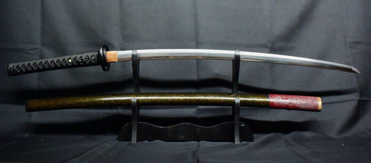 柄は関西の武道具商社のもの。目釘穴は水平に開いています。(穴径5mm)