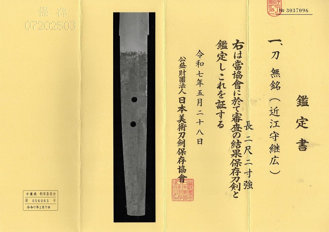 【新刀】越前康継の子 近江守継広 日刀保 保存鑑定 67cm 刀身重量750g 元幅約3.1cm 元重 約7mm 研磨済! 外装新品!