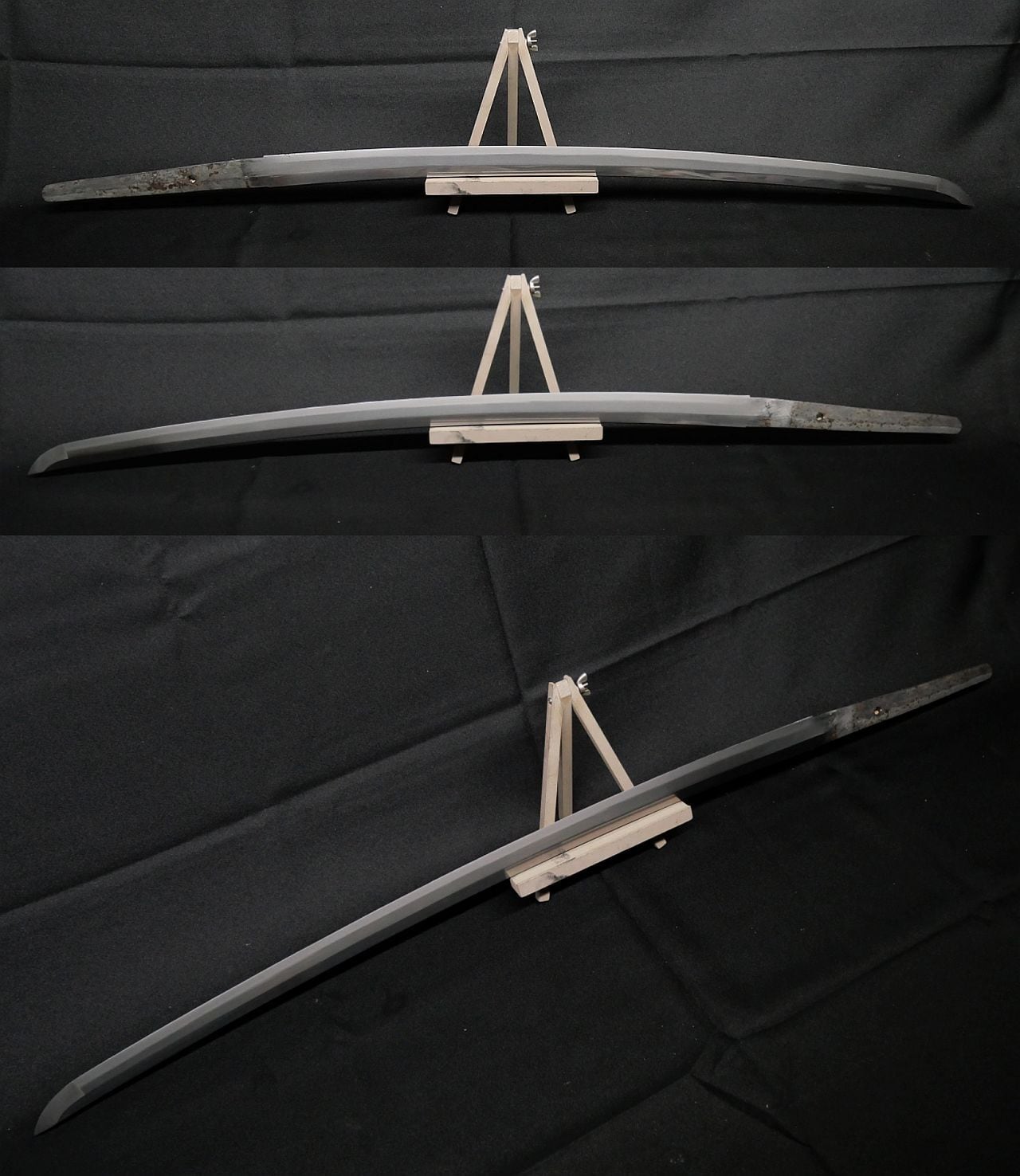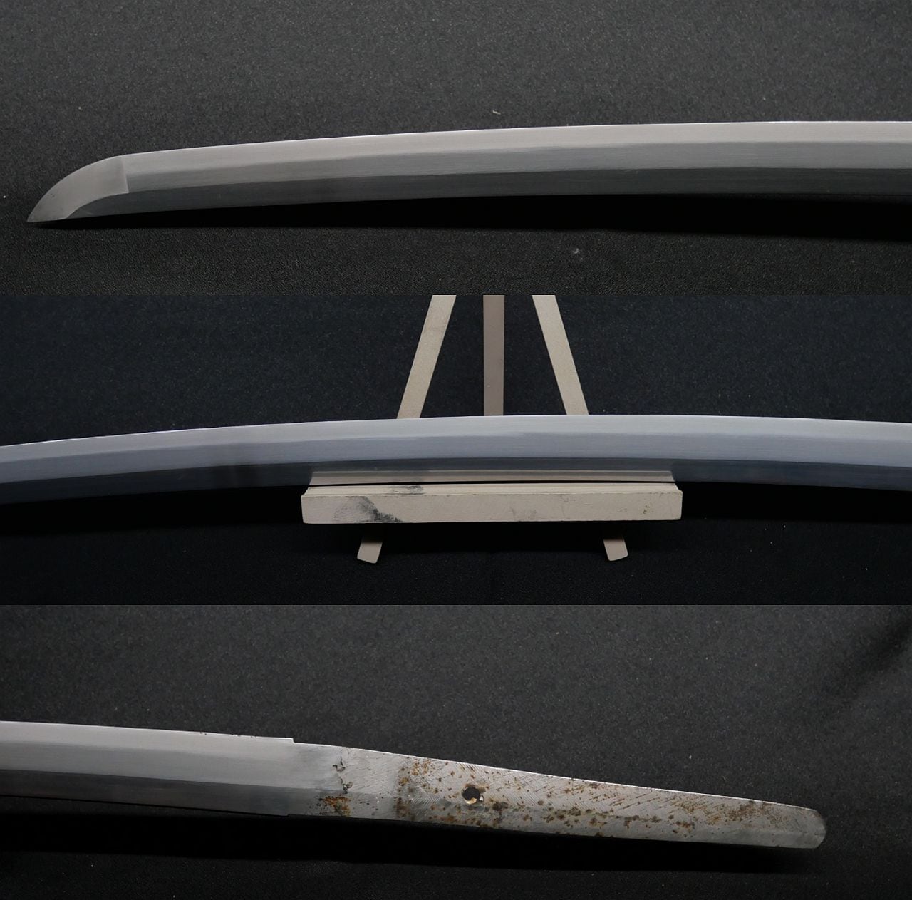 茎の状態からステンレス刀とも思いましたが磁石に付くので、ズブ焼きの造兵刀だと思います。