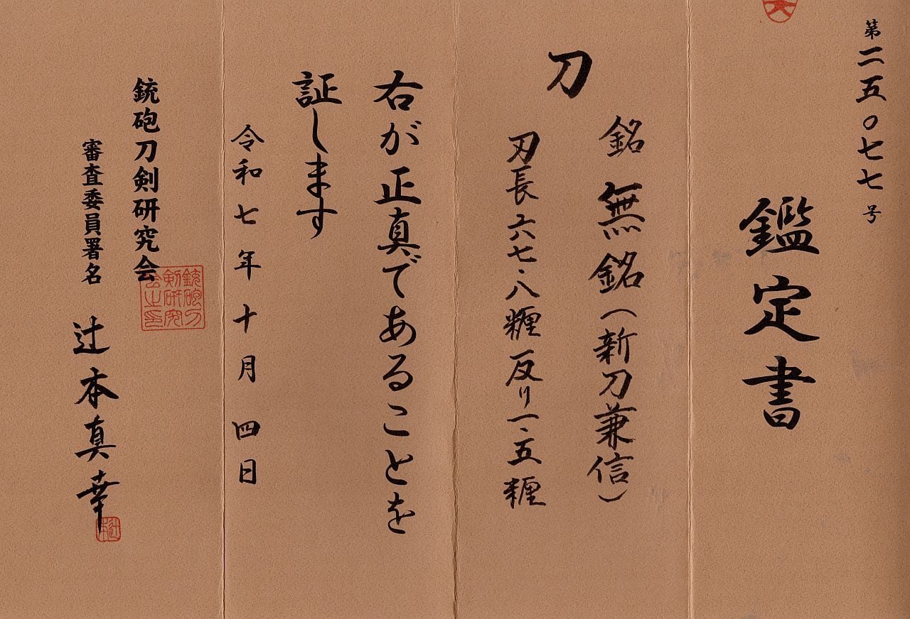 銃砲刀剣研究会鑑定にて新刀兼信に極められた刀です。