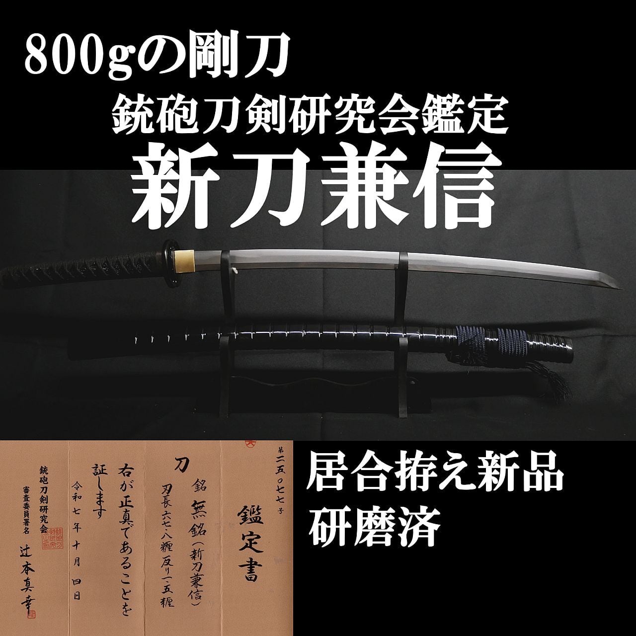 【新刀】銃砲刀剣研究会鑑定 新刀兼信 67.8cm 刀身重量800gの剛刀 元幅約3.1cm 元重 約7mm 研磨済! 居合外装拵え新品!!