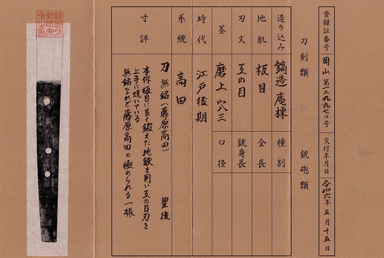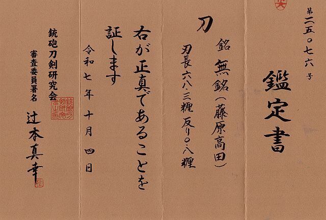 銃砲刀剣研究会鑑定にて江戸後期の藤原高田に極められた刀です。