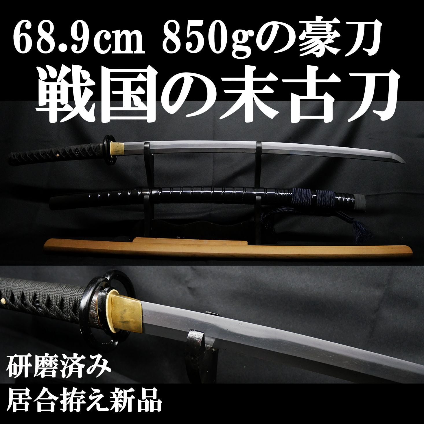 【古刀】68.9cm 刀身重量850gの豪刀! 元幅約3.2cm 元重 約8mm 研磨済! 居合外装新品!