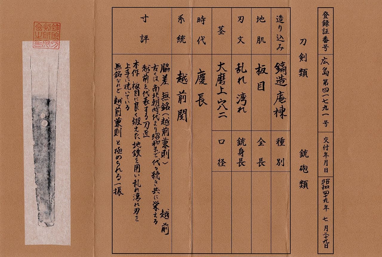 銃砲刀剣研究会鑑定に出した所、慶長新刀の越前兼則に極められた刀です。