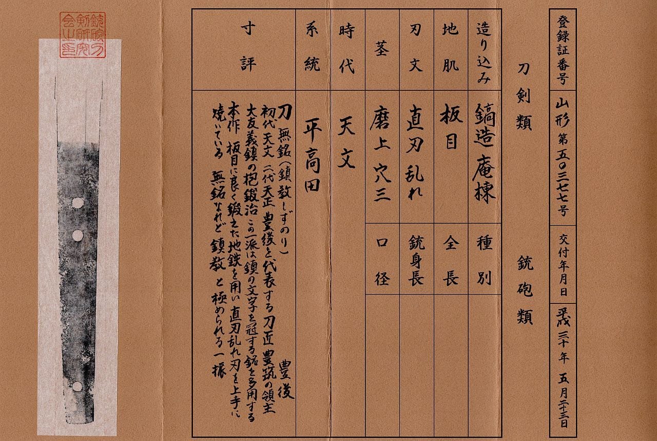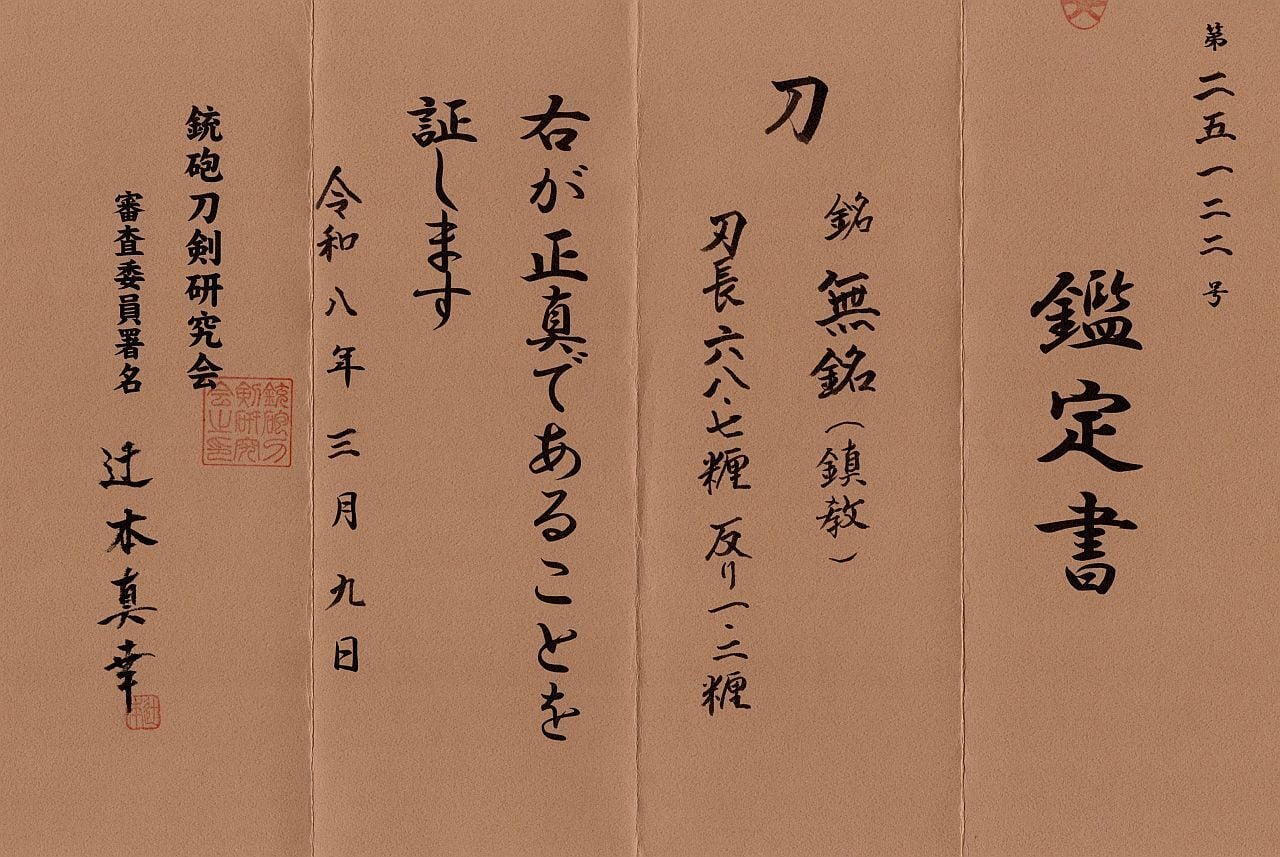 銃砲刀剣研究会鑑定に出した所、古刀の高田鎮教に極められた刀です。
