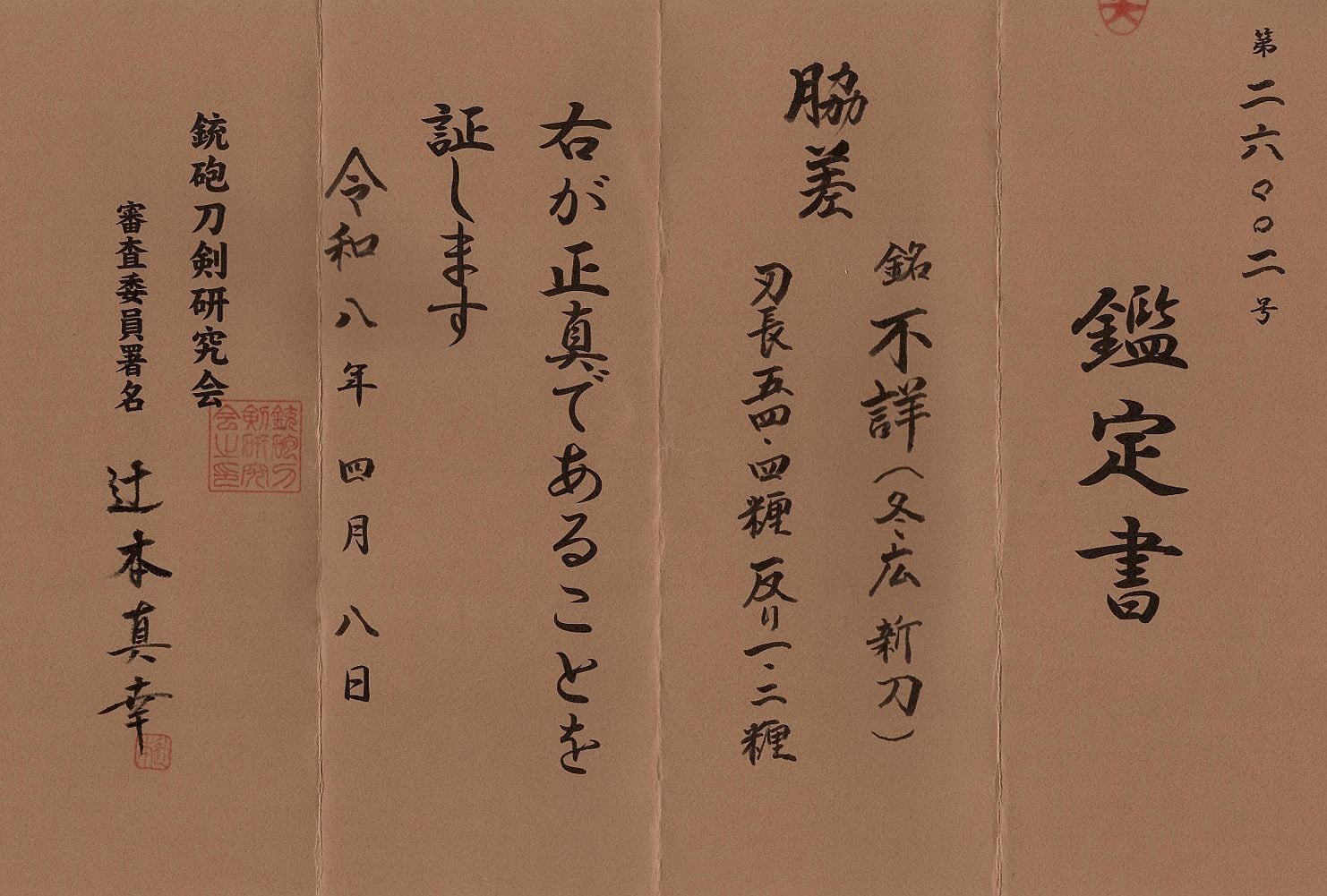 銃砲刀剣研究会鑑定にて新刀冬廣に極められた御刀です。